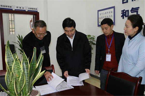 在張壩司法所,劉志誠察看了社區(qū)矯正宣告室、人民調(diào)解室、法律援助工作站,仔細(xì)翻閱相關(guān)資料,關(guān)切詢問工作人員司法所人民調(diào)解、法律援助等業(yè)務(wù)工作情況及對司法行政工作意見建議。走進(jìn)龍馬潭區(qū)誠達(dá)公證處,映入眼簾的標(biāo)識標(biāo)牌讓劉志誠對該處的黨建引領(lǐng)和文化建設(shè)表示滿意,他親切地與公證員交流互動,了解公證處黨建促發(fā)展、公證參與司法輔助、“最多跑一次”、等工作情況。劉志誠指出,公證服務(wù)是黨委政府為民服務(wù)的形象和代表,要把人民群眾滿不滿意作為檢驗(yàn)公證工作成效的標(biāo)準(zhǔn),全心全意為群眾做好法律服務(wù)。在自貿(mào)區(qū)在建瀘州市公共法律服務(wù)中心,劉志誠指出,公共法律服務(wù)中心是服務(wù)群眾的窗口,在設(shè)計規(guī)劃中要拓寬思路,整合法律服務(wù)功能,從便民利民出發(fā),從群眾的需要做起,將公共法律服務(wù)中心建成群眾滿意、企業(yè)滿意、黨委政府滿意的標(biāo)準(zhǔn)化服務(wù)平臺。