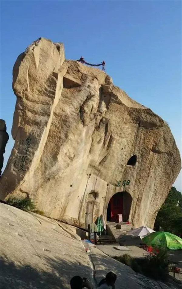 華山以石著名,每一處奇石都有一個美麗而動人的傳說。過了擦耳崖,看到的這兩塊石頭叫“日月巖”,左邊的代表“日”,右邊的代表“月”,上面這四個字是“云天弧光”,有時在夜晚,這里會出現(xiàn)一道非常耀眼的光。相傳武則天當年上華山走這里,看到這兩塊形似日月的石頭,就別出心栽地給自個兒的字號創(chuàng)造了一個“瞾”字,因為這兩塊奇石上頂青天,下臨空谷,唯我獨尊,是光明與權威的象征。