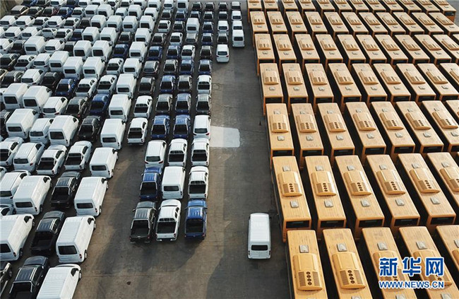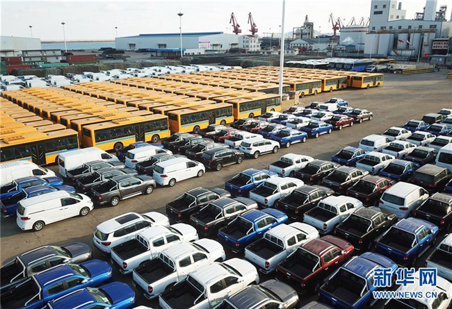 大批國產(chǎn)車輛在江蘇連云港港口碼頭等待裝船(2018年12月31日無人機(jī)拍攝)。 新華社發(fā)(耿玉和 攝)