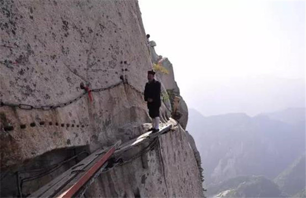長空棧道位于南天門外,是華山著名險(xiǎn)道之首。棧道分三段:南天門石坊至朝元洞西,路依崖鑿出,長20米,寬二尺許,為上段。折而下,崖隙橫貫鐵棍,形如凌空懸梯,游人須挽索逐級(jí)而下,稱之"雞下架",是為中段。再西折為下段,筑路者在峭壁上鑿出石孔,楔進(jìn)石樁,石樁之間架木椽三根,游人至此,須面壁貼腹,腳踏木椽橫向移動(dòng)前行。長空棧道是華山險(xiǎn)道中險(xiǎn)中之險(xiǎn)。