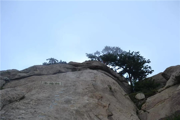 我和孩子抓緊時(shí)間往東峰趕,經(jīng)紫氣臺(tái)、二仙坎,攀爬一道石梁前往東峰山門。此時(shí)飄來(lái)小雨點(diǎn),我們顧不得腳下濕滑加快了腳步。經(jīng)鷂子翻身,孩子想要征服天險(xiǎn)的念頭依然強(qiáng)烈,一心想翻鷂子翻身,后因人多需排隊(duì)等候而暫時(shí)放棄。東峰又叫朝陽(yáng)峰,朝陽(yáng)臺(tái)是觀日出的勝地。我倆左轉(zhuǎn)攀爬朝陽(yáng)臺(tái),雨漸漸大起來(lái)。至臺(tái)頂,方舉目四顧,黃豆大小的密集雨點(diǎn)劈頭蓋臉砸下。朝陽(yáng)臺(tái)上沒(méi)有看到太陽(yáng),卻遭遇暴雨,我們狼狽撤離朝陽(yáng)臺(tái)。