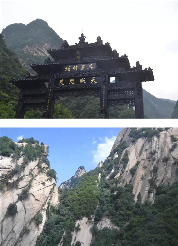 往西可去往中峰,往南可順原路返回,因暴雨如注,只得放棄攀爬中峰。順原路經(jīng)鷂子翻身,孩子仍念念不忘:“媽媽,這會(huì)兒大暴雨,肯定沒(méi)人排隊(duì),咱們?nèi)シ_子翻身!”聽(tīng)了孩子“初生牛犢不畏虎”的話,我不由哈哈大笑:“小傻瓜!這么大的暴雨,有誰(shuí)去翻鷂子翻身呢?不要命啦?”在鷂子翻身入口處,孩子還是萬(wàn)般眷戀地探身查看,當(dāng)看到還未來(lái)得及撤離的人員身系保險(xiǎn)繩懸掛在峭壁上,就像風(fēng)雨中掉著蛛絲的蜘蛛,被風(fēng)雨襲擊的無(wú)處藏身、進(jìn)退兩難,方才知道了害怕。