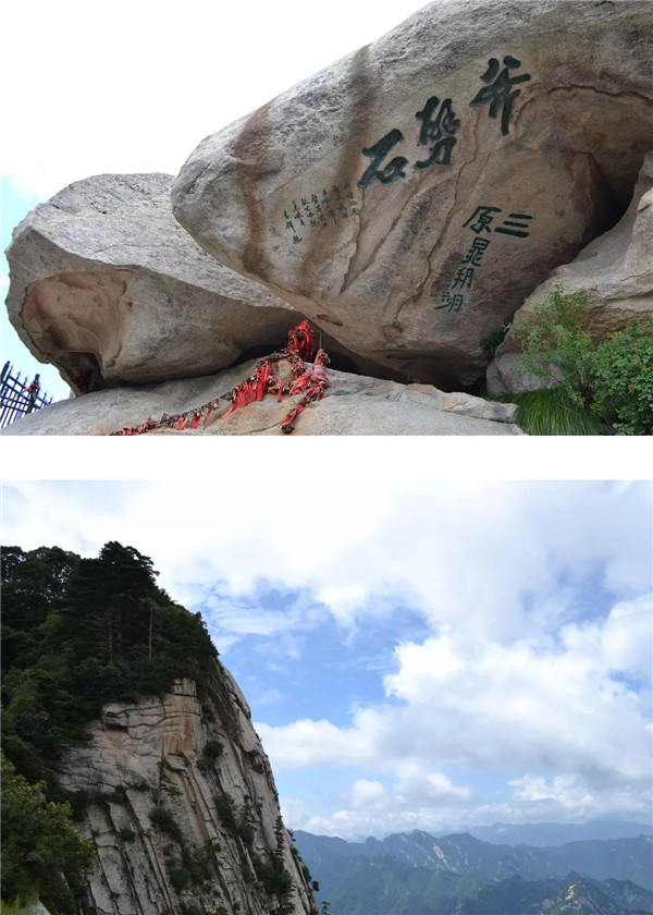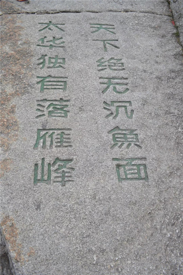 在南峰頂,孩子看到“天下絕無(wú)沉魚(yú)面,太華獨(dú)有落雁峰”的題刻,打趣我:“媽媽,你叫鴻雁,這里又叫落雁峰,真是和你有緣呢!快來(lái)這塊大石頭上落落腳,歇一歇!”“好啊!咱倆都爬累了,都歇一歇!”我為孩子的體貼欣慰!
