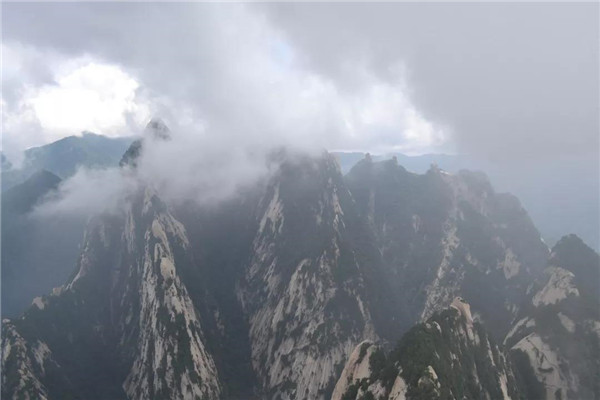 虧得我們準(zhǔn)備充分,帶有雨傘、雨衣、防雨鞋套。山頂風(fēng)狂雨暴,雨傘基本沒(méi)有遮蔽作用。即便穿著雨衣,腳蹬防雨鞋套,我和孩子也被澆成了“落湯雞”。直到坐上下行纜車,我倆才將懸著的一顆心放下。轎廂外,雨幕如瀑,雨霧籠罩了整個(gè)華山。華山尊嚴(yán)峻極、嵯峨崢嶸的一面,被雨霧遮掩了,有了朦朧秀麗的美。