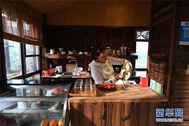工作人員在無錫宜興白塔村內(nèi)的一間茶室招待游客(2018年4月2日攝)。 新華社記者 季春鵬 攝