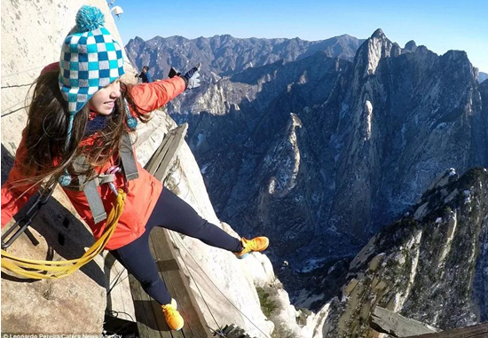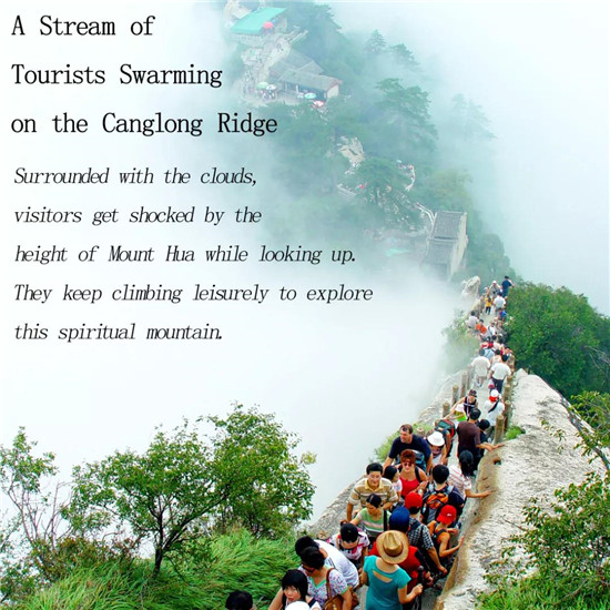 這是一個(gè)溫暖的美麗秋天,華山壯觀的峭壁在陽(yáng)光下閃閃發(fā)亮,稀有樹(shù)木炫耀著多彩的秋葉,遠(yuǎn)方跳躍的瀑布吸引著游客的眼球,奇形怪狀的點(diǎn)點(diǎn)白云在腳下緩緩流動(dòng)。我和我的朋友開(kāi)始了一場(chǎng)艱苦的旅行,一起攀登6,600多級(jí)鑿在巖石上的臺(tái)階,目標(biāo)是海拔2154.9米南峰之巔祭祀華山神的道觀?! ?