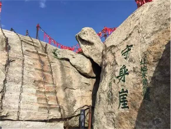 位于華山西峰頂摘星石北。民間傳說古時(shí)有個(gè)孝子,雙親身染重疾,久治不愈,聽說岳神靈驗(yàn),便登山拜神求醫(yī)。在向岳神祈禱的過程中,孝子許愿說只要雙親病愈,愿舍去自己的性命來報(bào)答神靈。果然,當(dāng)孝子返回家中時(shí),父母都已康復(fù),且已下田耕作去了。孝子還愿來到華山,毫不猶豫的從此處跳下深淵,可他卻覺得身體若有人托起,似乘長風(fēng),飄飄欲仙。待清醒時(shí),原來依然躺在家中,似夢非夢。孝子知道是華山神暗中相助,便告別父母到華山西峰作了道士。后人被孝子的誠心感動(dòng),就將此處命名為舍身崖。清道光年間李榕的伯祖李仁龍為阻止后人仿效孝子的行為,改舍身崖為省身崖,以警示忤逆之街徒游到這里時(shí)應(yīng)對照孝子,自警自省,痛改前非。后來又有人認(rèn)為舍身救雙親的行為并不可取,也稱崖作守身崖,以教育后人生命可貴,不可輕擲。
