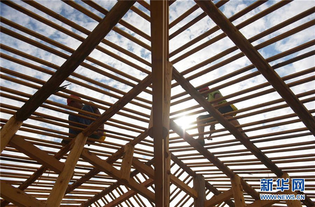在湖北省宣恩縣曉關(guān)侗族鄉(xiāng),工人在建設(shè)吊腳樓(2018年7月26日攝)。2018年,當(dāng)?shù)卣_始修建6座新的侗寨吊腳樓,為符合易地搬遷政策的貧困戶實施搬遷。新華社發(fā)(王俊 攝)