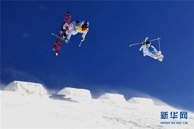 運(yùn)動員在河北張家口市崇禮區(qū)太舞滑雪場參加自由式滑雪雪上技巧世界杯比賽(2018年12月16日攝)。新華社記者 楊世堯 攝