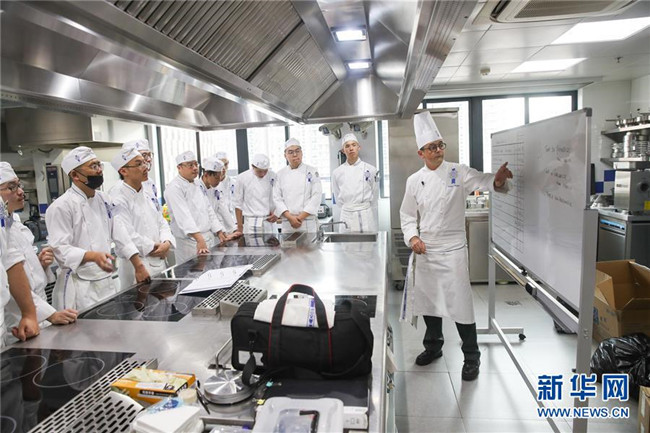 這是2018年10月17日, 來自法國的菲利普(右)在上海藍帶廚藝職業(yè)技能培訓學校的教室內給學員們教授法式廚藝。 新華社記者 丁汀 攝