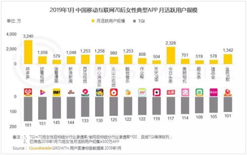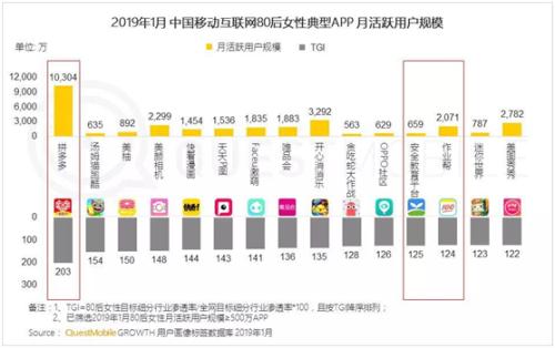 在拼多多、今日頭條、新浪微博、美顏相機(jī)及各類短視頻等女性最愛打開的20多個(gè)APP中,移動(dòng)互聯(lián)網(wǎng)70和80后女性最愛使用的典型APP是新電商平臺(tái)拼多多,達(dá)到3240萬,TGI(Target Group Index,目標(biāo)群體指數(shù))高達(dá)80.5%,超過各類短視頻應(yīng)用。