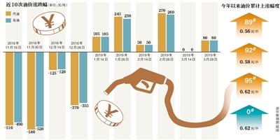 此前的2月28日,國內(nèi)汽油、柴油價格(標準品,下同)分別上調(diào)270元/噸、260元/噸,不僅是我國成品油2019年來的“四連漲”,更是創(chuàng)下今年來最大上漲幅度。3月14日,汽油、柴油價格終于停下上漲的步伐——國內(nèi)成品油價格不作調(diào)整。數(shù)據(jù)顯示,上一次油價擱淺為去年3月14日,成為當年唯一的一次擱淺。