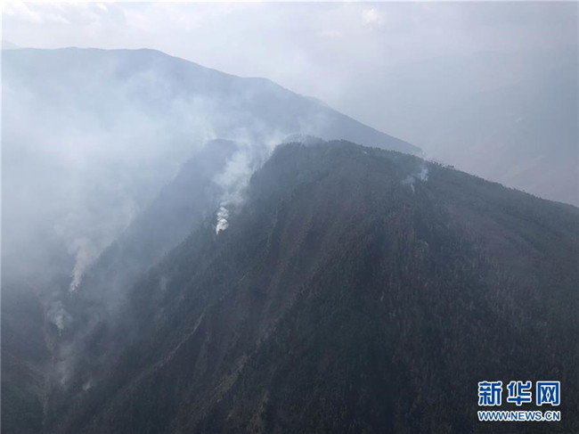 俯瞰四川省涼山州木里縣雅礱江鎮(zhèn)火場火點(4月1日攝)。新華社發(fā)(林繼平 攝)