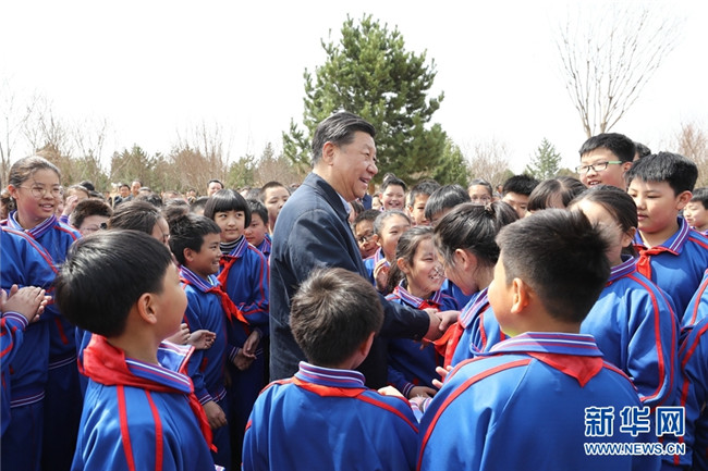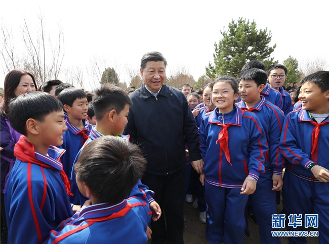 4月8日,黨和國(guó)家領(lǐng)導(dǎo)人習(xí)近平、栗戰(zhàn)書(shū)、汪洋、王滬寧、趙樂(lè)際、韓正、王岐山等來(lái)到北京市通州區(qū)永順鎮(zhèn)參加首都義務(wù)植樹(shù)活動(dòng)。這是習(xí)近平同少先隊(duì)員在一起。 新華社記者 鞠鵬 攝