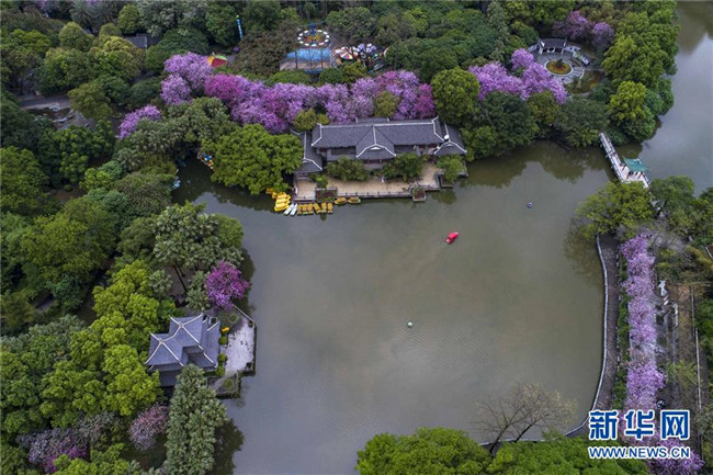 4月14日,在廣西柳州市柳侯公園,盛開的洋紫荊把公園裝扮得格外美麗(無(wú)人機(jī)拍攝)。