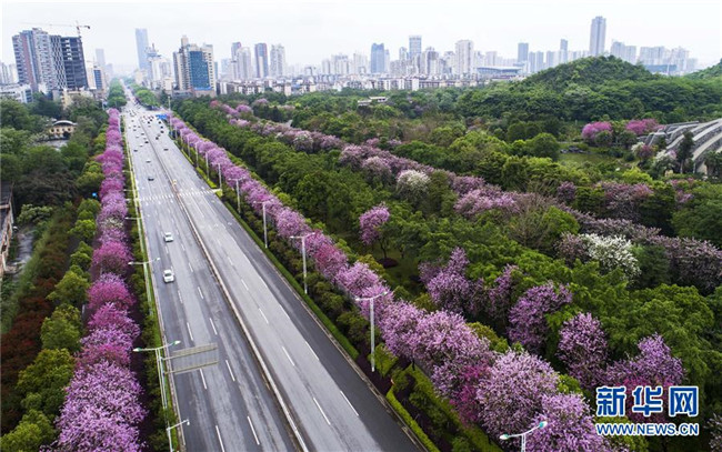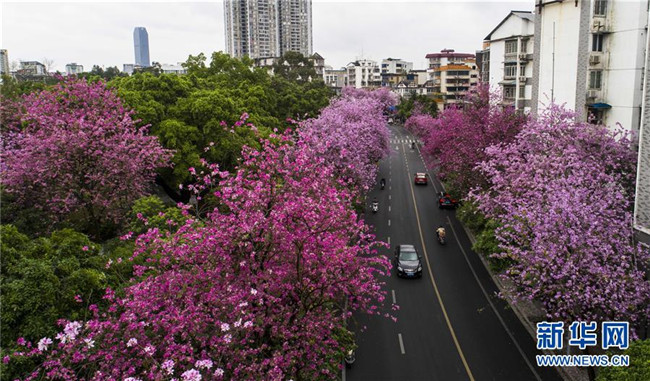 當(dāng)日,一場(chǎng)大雨過(guò)后,廣西柳州市內(nèi)的洋紫荊開得格外嬌艷。時(shí)下,柳州市區(qū)27萬(wàn)株洋紫荊進(jìn)入盛花期。 新華社記者 黃孝邦 攝