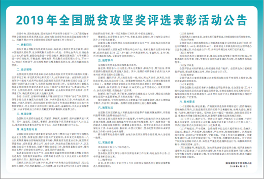 經(jīng)黨中央、國(guó)務(wù)院批準(zhǔn),國(guó)務(wù)院扶貧開(kāi)發(fā)領(lǐng)導(dǎo)小組在“十三五”期間每年開(kāi)展全國(guó)脫貧攻堅(jiān)獎(jiǎng)評(píng)選活動(dòng),表彰為脫貧攻堅(jiān)作出突出貢獻(xiàn)的組織和個(gè)人。現(xiàn)就開(kāi)展2019年全國(guó)脫貧攻堅(jiān)獎(jiǎng)評(píng)選表彰工作公告如下。