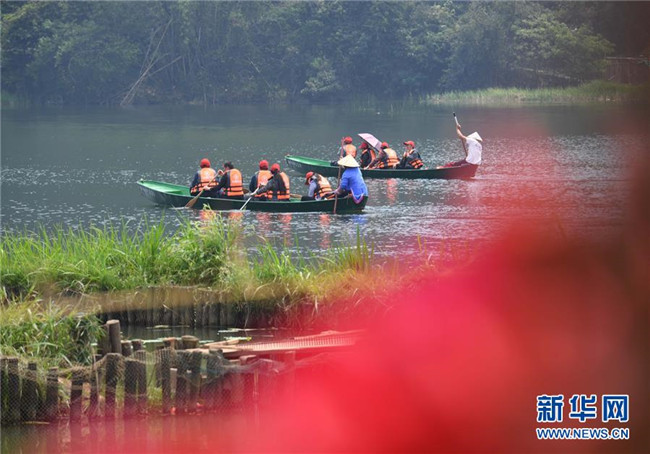 4月14日,游人在普者黑國家濕地公園蕩舟觀景。 位于云南省文山壯族苗族自治州丘北縣的普者黑國家濕地公園山水秀麗、風景如畫,吸引人們前來休閑度假。 新華社記者楊宗友攝