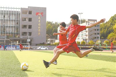 日前,湖北省武漢市英山縣思源實(shí)驗(yàn)學(xué)校綠茵操場上,學(xué)生正在進(jìn)行攔截?fù)屒蛴?xùn)練。為了培養(yǎng)學(xué)生的足球興趣,該校開展了“陽光足球大課間”體育活動,倡導(dǎo)全體師生充分享受課間足球運(yùn)動。(單藝偉/攝)