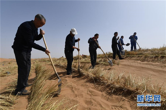 在甘肅省古浪縣境內(nèi)的黑崗沙風沙口,八步沙第二代治沙人用稻草壓沙(2019年3月26日攝)。新華社記者 范培珅 攝