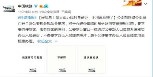 據(jù)中國(guó)鐵路總公司官方微博消息,公安部鐵路公安局召開全路公安機(jī)關(guān)視頻會(huì)要求,對(duì)于辦理乘車臨時(shí)身份證明交費(fèi)照相問(wèn)題,要本著方便旅客、服務(wù)旅客的原則,公安制證窗口一律通過(guò)公安部人口信息系統(tǒng)核實(shí)辦證人員身份,不得要求辦證人員提供照片,更不允許要求辦證人員到指定地點(diǎn)照相辦理。