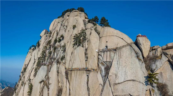 華山長空棧道位于華山南峰東側(cè)山腰。相傳,是華山派第一代宗師元代高道賀志真為遠(yuǎn)離塵世靜修成仙,在萬仞絕壁上鑲嵌石釘搭木椽而筑。棧道上下皆是懸崖絕壁,鐵索橫懸,由條石搭成尺許路面,下由石柱固定,游人至此,面壁貼腹屏氣挪歩,是“全球十大恐怖的懸崖步道”之一。