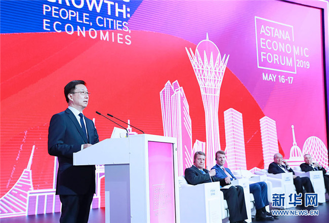 5月16日,中共中央政治局常委、國務(wù)院副總理韓正出席在努爾蘇丹舉行的第十二屆阿斯塔納經(jīng)濟論壇。 新華社記者 劉彬 攝