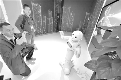 5月26日,參觀者在2019中國國際大數(shù)據(jù)產(chǎn)業(yè)博覽會上與5G+智能機(jī)器人進(jìn)行拍照互動。記者 楊文斌 攝