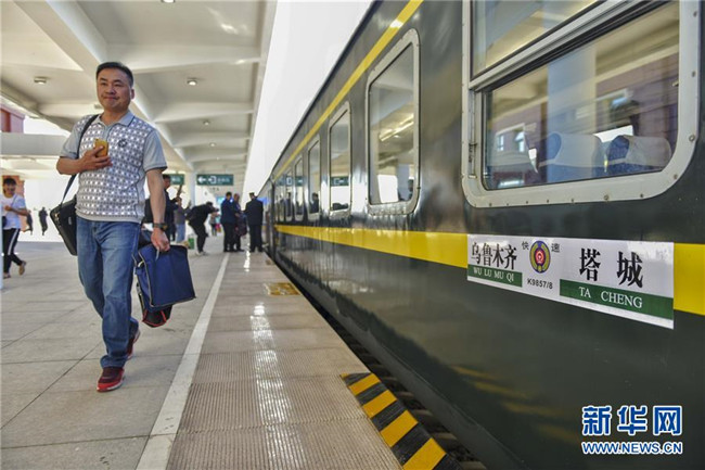 5月30日,在新疆塔城火車站,旅客準備登上塔城—烏魯木齊K9858次列車。新華社發(fā)(擺風亮 攝)