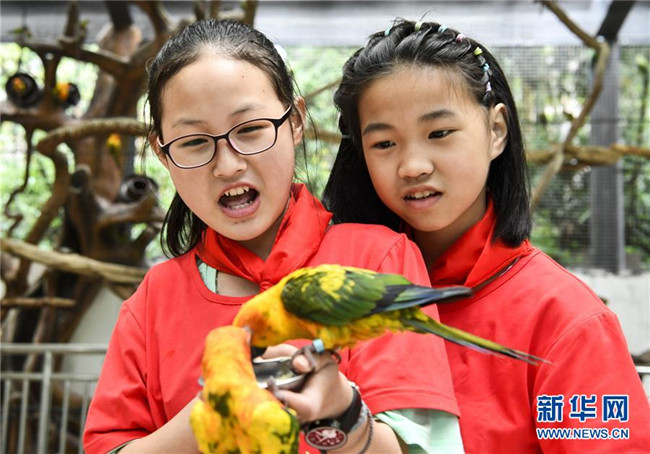 5月29日,在重慶市動物園內(nèi)的互動區(qū),蓼子鄉(xiāng)第一中心小學的學生們給鸚鵡喂食。新華社記者 劉潺 攝