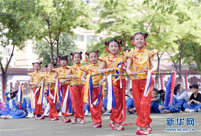 5月30日,呼和浩特市新城區(qū)滿族小學(xué)的學(xué)生在表演滿族花棍舞。