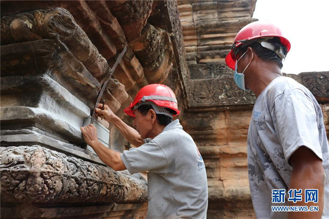 在柬埔寨暹粒,中國——柬埔寨政府吳哥古跡保護工作隊進行茶膠寺保護修復(fù)項目的結(jié)項收尾工作(2018年7月9日攝)。新華社記者 毛鵬飛 攝