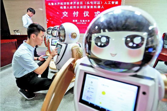 6月10日,在烏魯木齊經(jīng)濟技術開發(fā)區(qū)(頭屯河區(qū))維泰大廈,新疆創(chuàng)澤機器人科技有限公司工程師在調試機器人“創(chuàng)創(chuàng)”。 當日,該公司生產(chǎn)的75臺人工智能機器人正式交付經(jīng)開區(qū)(頭屯河區(qū))政務服務、社區(qū)、學校等場所,這也標志著烏魯木齊經(jīng)開區(qū)(頭屯河區(qū))國家級人工智能機器人應用示范區(qū)正式啟動。(謝龍)