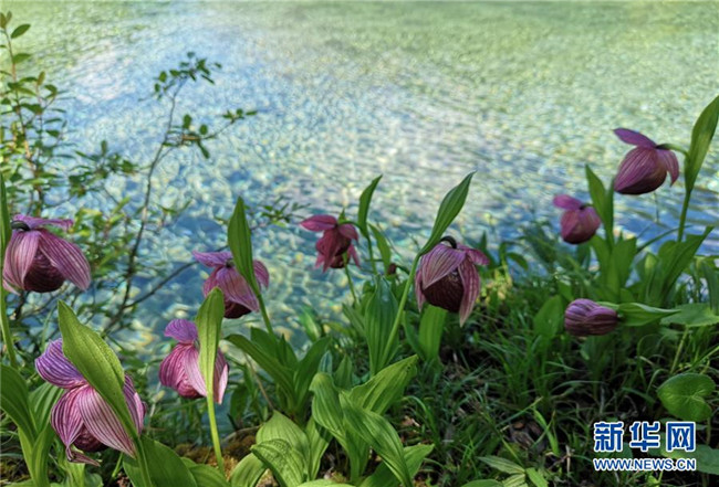 這是在四川黃龍自然保護(hù)區(qū)黃龍溝鈣化池邊拍攝的西藏杓蘭(6月12日攝)。 新華社記者江宏景攝