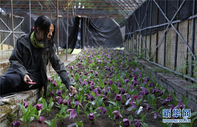6月12日,在四川黃龍管理局花卉培育基地,四川黃龍自然保護(hù)區(qū)的高級顧問干文清在給人工保育的杓蘭標(biāo)注標(biāo)識。 新華社記者江宏景攝