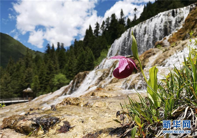 這是在四川黃龍自然保護(hù)區(qū)黃龍溝瀑布邊拍攝的西藏杓蘭(6月12日攝)。 新華社記者江宏景攝