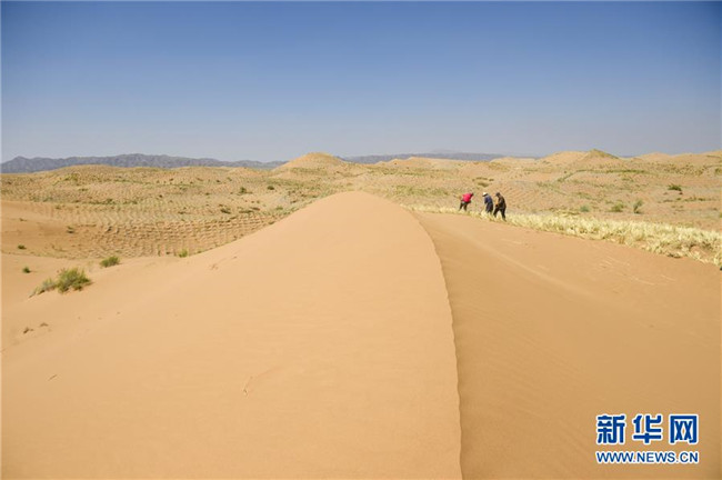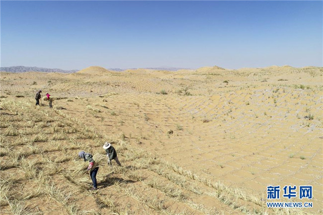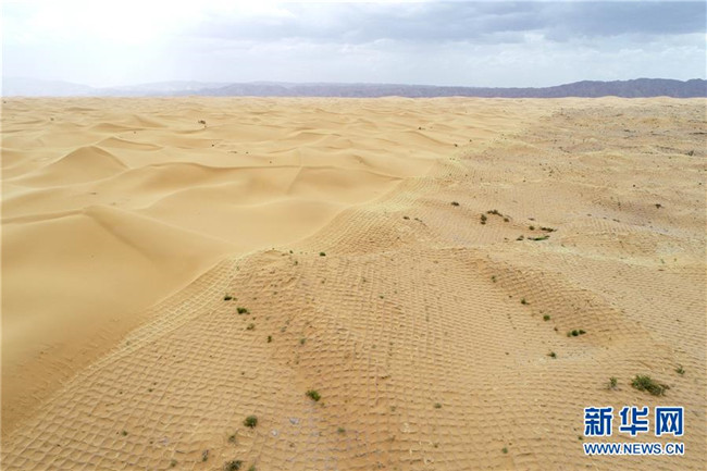 寧夏中衛(wèi)市位于騰格里沙漠南緣,在長期抵抗沙漠化侵襲的實(shí)踐和探索中,一套“先固后治,固阻結(jié)合”的防沙治沙新模式在這里應(yīng)用。人們利用草方格固沙,在扎好的草方格中播撒草種,形成植物沙障。據(jù)了解,截至2018年底中衛(wèi)市已完成沙區(qū)治理147萬畝。新華社記者馮開華攝