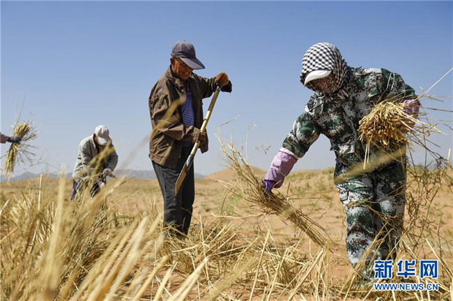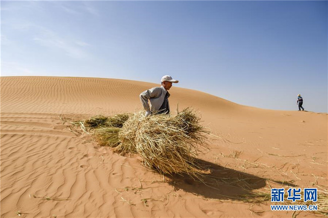 在寧夏中衛(wèi)市長流水沙區(qū),治沙工人在沙漠中搬運(yùn)麥草(6月13日攝)。新華社記者馮開華攝