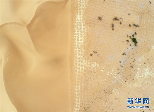 寧夏中衛(wèi)市長流水沙區(qū),一邊是沙漠,一邊是用草方格治理后的區(qū)域(6月12日無人機(jī)拍攝)。