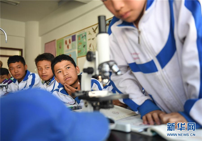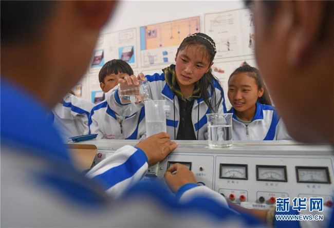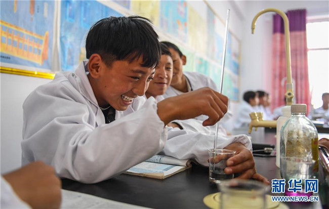 鹽井中學(xué)的學(xué)生們?cè)谏匣瘜W(xué)課(6月6日攝)。年輕的藏族女教師坐在鋼琴前,手指靈動(dòng)地彈奏樂(lè)曲,兩名學(xué)生拉起弦子伴奏,三十多名學(xué)生站成四排,齊聲合唱。學(xué)校籃球場(chǎng)上數(shù)名身材高大的學(xué)生,正在體育老師的組織下進(jìn)行激烈的分組對(duì)抗,不一會(huì)兒,學(xué)生們個(gè)個(gè)汗流浹背。綜合樓三樓的化學(xué)實(shí)驗(yàn)室內(nèi),身穿白色大褂的學(xué)生,分成若干小組,正在做簡(jiǎn)單的化學(xué)實(shí)驗(yàn)。這一幕幕,同時(shí)出現(xiàn)在西藏昌都市芒康縣鹽井中學(xué)。新華社記者晉美多吉攝