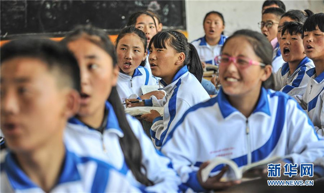 鹽井中學(xué)的學(xué)生們?cè)谏嫌⒄Z(yǔ)課(6月6日攝)。年輕的藏族女教師坐在鋼琴前,手指靈動(dòng)地彈奏樂(lè)曲,兩名學(xué)生拉起弦子伴奏,三十多名學(xué)生站成四排,齊聲合唱。學(xué)?;@球場(chǎng)上數(shù)名身材高大的學(xué)生,正在體育老師的組織下進(jìn)行激烈的分組對(duì)抗,不一會(huì)兒,學(xué)生們個(gè)個(gè)汗流浹背。綜合樓三樓的化學(xué)實(shí)驗(yàn)室內(nèi),身穿白色大褂的學(xué)生,分成若干小組,正在做簡(jiǎn)單的化學(xué)實(shí)驗(yàn)。這一幕幕,同時(shí)出現(xiàn)在西藏昌都市芒康縣鹽井中學(xué)。新華社記者晉美多吉攝