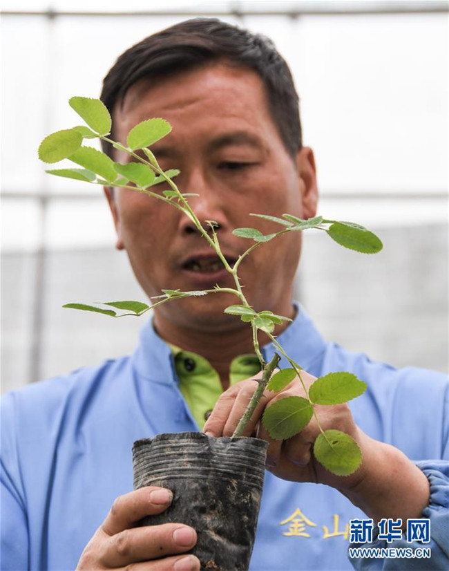 6月26日,在四川省小金縣清多香玫瑰種植專業(yè)合作社,技術(shù)人員在查看玫瑰幼苗。新華社記者 高健鈞 攝