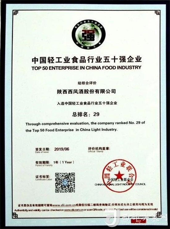近日,由中國輕工業(yè)聯(lián)合會主辦,主題為“強化科技創(chuàng)新,服務(wù)美好生活”的“中國輕工業(yè)百強企業(yè)高峰論壇”在北京召開。會上,中國輕工業(yè)聯(lián)合會公布了2018年度中國輕工業(yè)食品行業(yè)五十強企業(yè),西鳳股份公司憑借良好的發(fā)展業(yè)績、市場口碑、行業(yè)競爭力及日益增強的品牌影響力,被中國輕工業(yè)聯(lián)合會授予“中國輕工業(yè)食品行業(yè)五十強企業(yè)”榮譽稱號,并受到表彰獎勵。