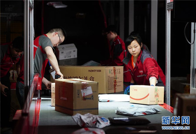 工人在位于西安的京東智能物流中心細分區(qū)龍門架下整理包裹(6月3日攝)。龍門架掃描后,包裹的出庫物流信息將自動更新。新華社記者 邵瑞 攝
