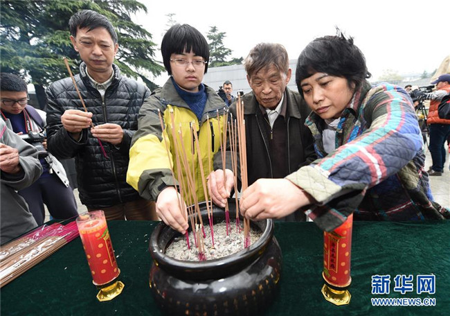 南京大屠殺幸存者常志強(右二)率親屬在侵華日軍南京大屠殺遇難同胞紀念館內(nèi)的遇難者名單墻前焚香(2015年4月5日攝)。新華社記者孫參攝