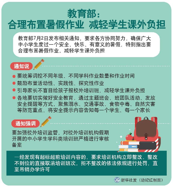 暑假將至,教育部2日發(fā)布相關(guān)通知,要求各方協(xié)同努力,確保廣大中小學生度過一個安全、快樂、有意義的暑假,特別指出要合理布置暑假作業(yè),減輕學生課外負擔。