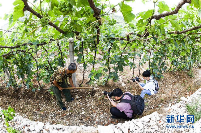 7月2日,河北傳媒學(xué)院的學(xué)生在河北遵化市新店子鎮(zhèn)沙石峪村葡萄園里采訪拍照。 新華社發(fā)(劉滿(mǎn)倉(cāng) 攝)