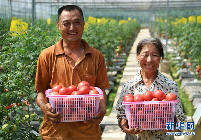7月2日,馬灌鎮(zhèn)果園村村民在展示剛從無土栽培西紅柿大棚內(nèi)采摘下來的西紅柿。新華社記者 王全超 攝