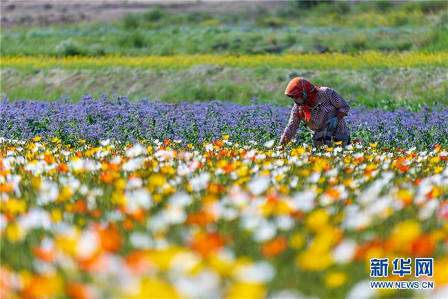 7月6日,甘肅省高臺(tái)縣新壩鎮(zhèn)紅沙河村村民在花田中勞作。 新華社發(fā)(鐘曉亮 攝)