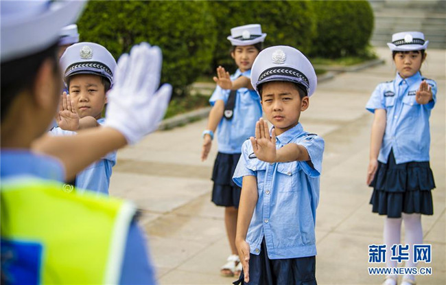 7月9日,武邑縣公安交警大隊(duì)的民警指導(dǎo)“小交警”學(xué)習(xí)交通指揮手勢(shì)。新華社記者 李曉果 攝